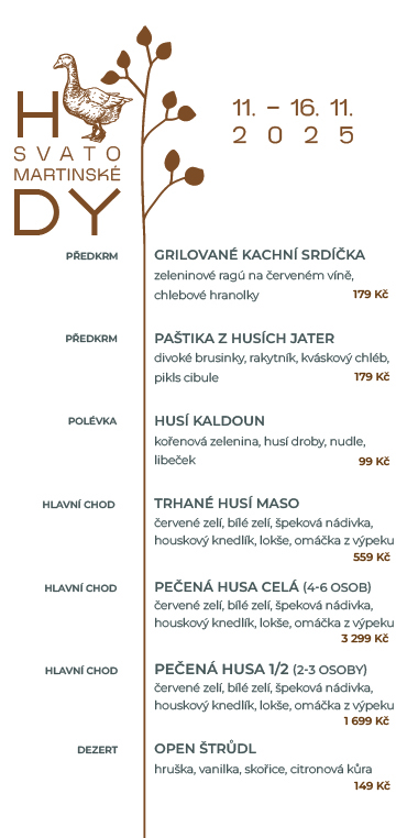 Těšit se můžete na nabídku plnou husích specialit. Moderní, přesto tradiční menu je doplněno o výběr svatováclavských vín z Vinařství Špalek.