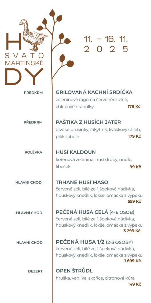 Celou svatomartinskou nabídku si vychutnáte od úterý do neděle, od 17.00-21.00 hodiny, a to pouze na základě předchozí rezervace. Rezervaci stolu doporučujeme předem, proto prosím navštivte náš online rezervační formulář či volejte +420 777 355 334.